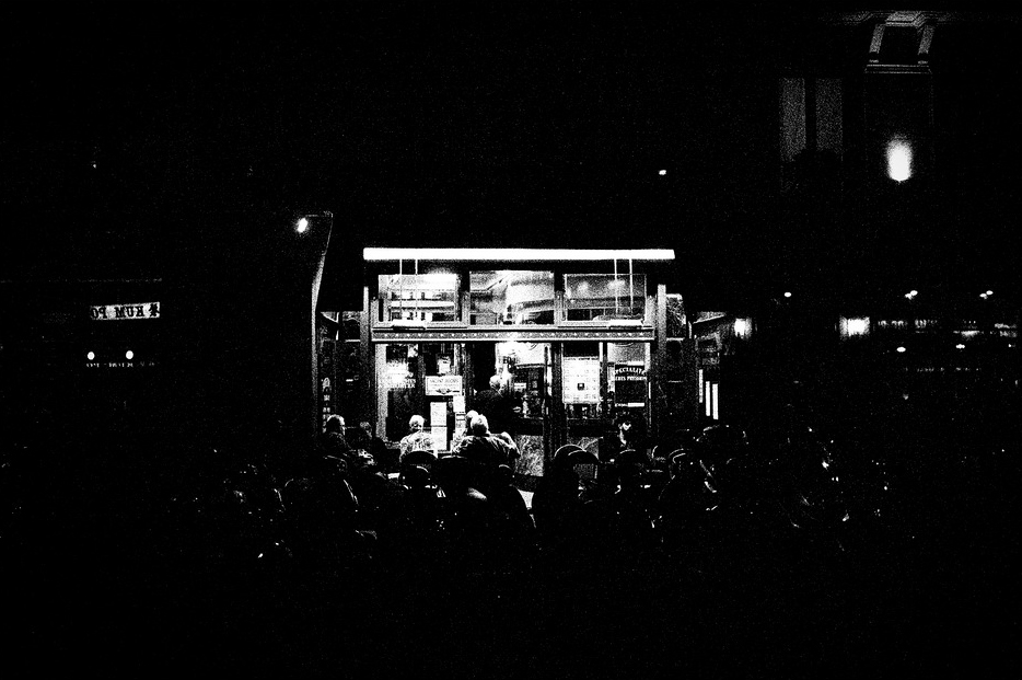 A high-contrast black and white photo captures the essence of nuit as a small, illuminated kiosk stands surrounded by shadows. People gather around it, forming a dense and indistinct crowd. The background remains mostly dark, with only a few dim lights barely visible.